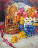 This painting was the center of attention at a gathering of old friends last month and each related her personal life's story using the objects in the painting as symbols for comments. I liked Cindy saying that we are like the grapes and when we reach just the right point of maturity, we´ll become a fine wine and fill the empty bottle. Sally said we are like the silver, because even though we get "tarnished" by life´s challenges, we still polish up and regain our luster!